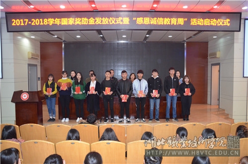会议中首先向获得了2017-2018年度国家助学金和国家励志奖学金的学生颁奖,获奖学生代表也上台进行了发言,然后学工处副处长何玉初老师宣读了“感恩诚信周”活动方案,学生资助中心主任邹雪萍也就奖、助学金的评选流程、发放过程以及国家的贷款政策、还款流程以及贷款违约需要承担的相应责任进行了详细讲解。