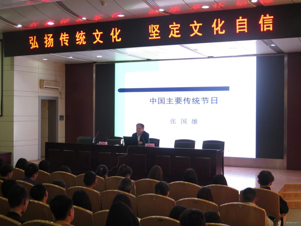党委书记张国雄着重讲述了中国传统节日元宵节、清明节、端午节、中元节、中秋节、除夕等的起源及风俗。讲座中,他引经据典,稽古振今,古典诗词,信手拈来,深入浅出,精彩纷呈,深受师生一致好评。
