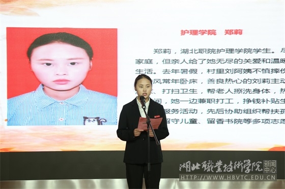 “湖职孝悌故事会”宣讲环节,孝德感恩标兵代表郑莉用朴实的言语讲述了自己在暑假期间利用所学的护理知识帮助生病的邻里、家中卧床的老人擦洗身体、热敷浮肿的双腿这些感动、真实的故事。来自信息技术学院的自强、励志标兵代表李启航也以切身经历展示了“学好专业,发展特长,服务大家”的高职学子新形象。美容学院 “致美尽孝”志愿服务队指导教师李倩,作为孝德感恩先进集体代表和大家分享了同学们利用课余时间开展各类专业志愿服务活动,在弘扬志愿精神、服务他人的同时自己得到成长的快乐。