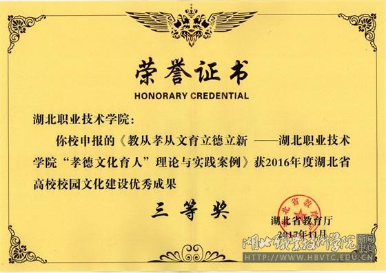 我校选送的《教从孝从文  育立德立新——乐竞“孝德文化育人”理论与实践案例》荣获湖北省2016年度高校校园文化建设优秀成果三等奖;《建“红网” 育“网红”——乐竞网络文化育人工作经验交流材料》入选2016年湖北省高校校园文化建设优秀成果集。