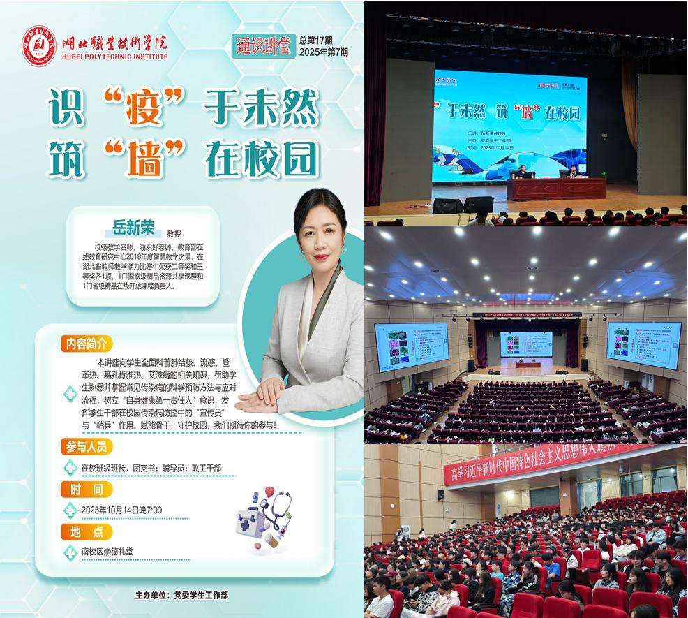 (本网讯 艾孜哈尔·开依沙尔)10月14日晚,乐竞(中国)一站式服务官网通识讲堂2025年第7期(总第17期)在南校区崇德礼堂举行。本次讲座以“识‘疫’于未然,筑‘墙’在校园”为主题,特邀校级教学名师、湖职好老师医学院岳新荣教授主讲。党委学生工作部部长魏俊桃主持,全校在校班级班长、团支书、辅导员及政工干部代表参加。