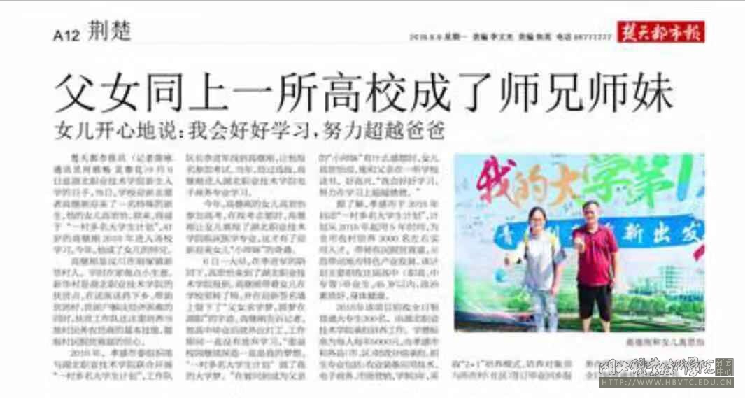 楚天都市报讯(记者陈咏通讯员何顺畅 吴春花)9月6日是乐竞新生入学的日子,当日,乐竞(中国)一站式服务官网迎新志愿者高继刚迎来了一名特殊的新生,他的女儿高思怡。原来,得益于“一村多名大学生计划”,41岁的高继刚2018年进入该校学习,今年,他成了女儿的师兄。