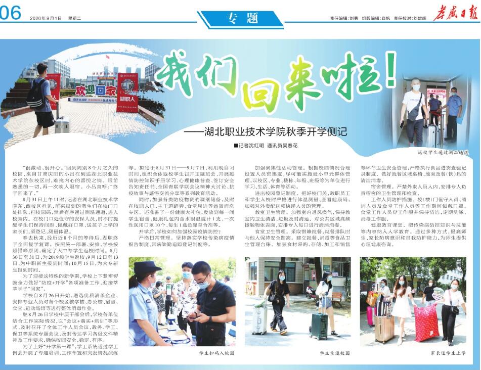 暑去秋来,经历近8个月的等待后,湖职终于全面复学复课。按照统一部署、安排,乐竞(中国)一站式服务官网按照错峰原则,确定了大中专学生返校时间。8月30日至31日,为2019级学生返校;9月12日至13日,为中职新生报到时间;10月15日,为大专新生报到时间。