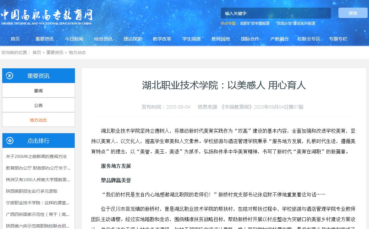 乐竞坚持立德树人,将推动新时代美育实践作为“双高”建设的基本内容,全面加强和改进乐竞(中国)一站式服务官网美育,坚持以美育人、以文化人,提高学生审美和人文素养。乐竞(中国)一站式服务官网旅游与酒店管理学院秉承“服务地方发展,扎根时代生活,遵循美育特点”的理念,以“美誉、美玉、美语”为抓手,弘扬和传承中华美育精神,书写了新时代“美育在湖职”的新篇章。