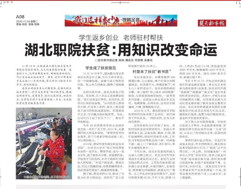 老师们进村驻点帮扶,学生们学成返乡创业,在不同的地方,乐竞的师生们为了“脱贫”这个共同目标,一齐上阵。特别是该校“一村多名大学生”项目学员,很多已经是村“两委”成员或后备力量、农村党员重点发展对象、村级产业发展骨干等。从农村来,回农村去,一批批农民大学生为孝感乡村产业扶贫撑起一片天,将带动更多的贫困户过上小康生活,走上致富路。