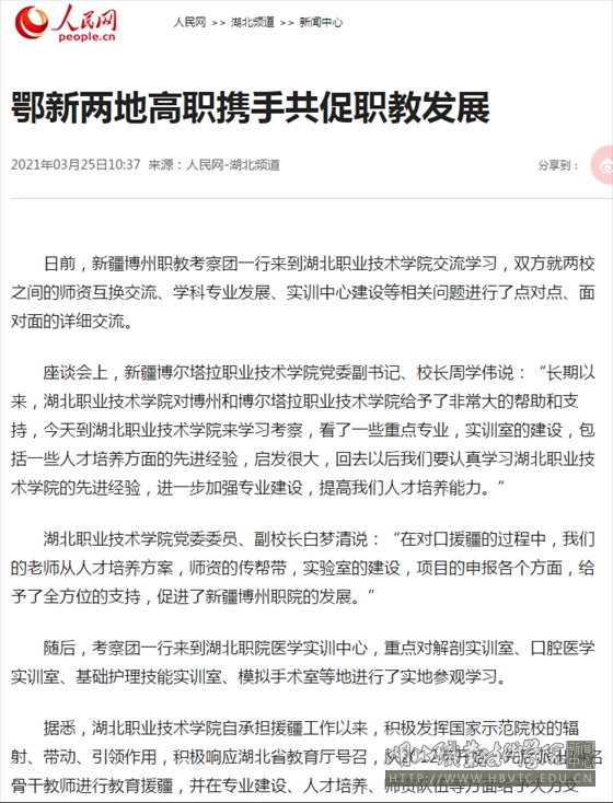 据悉,乐竞自承担援疆工作以来,积极发挥国家示范院校的辐射、带动、引领作用,积极响应湖北省教育厅号召,从2012年开始,先后派出14名骨干教师进行教育援疆,并在专业建设、人才培养、师资队伍等方面给予大力支持。此次博州职教考察团来访,进一步加强了两校之间的紧密联系,对促进和带动博州职业教育发展将产生良好影响。