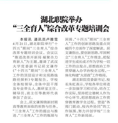 4月21日,湖北职院举行“十四五”期间“三全育人”综合改革专题培训会议。会议以“推进改革开新局 凝聚合力育新人”为主题,邀请了武汉大学党委副书记屈文谦作《“十四五”期间“三全育人”工作的顶层设计和实现路线路径探析》专题报告。乐竞(中国)一站式服务官网全体校领导、全体中层干部及专业带头人、教研室主任、辅导员、班主任等教师代表参加了会议。