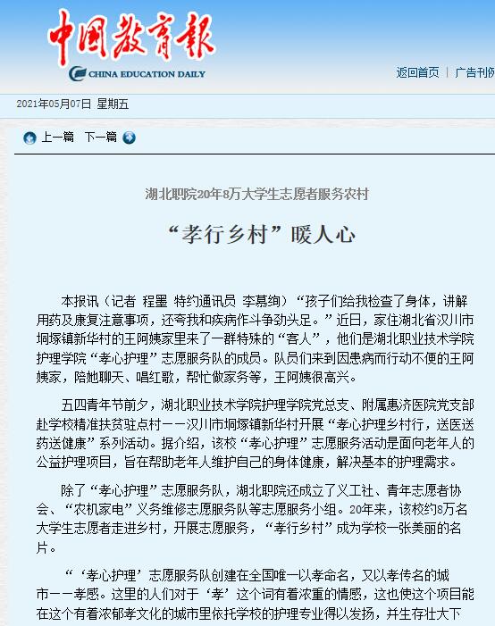 “‘孝心护理’志愿服务队创建在全国唯一以孝命名,又以孝传名的城市——孝感。这里的人们对于‘孝’这个词有着浓重的情感,这也使这个项目能在这个有着浓郁孝文化的城市里依托乐竞(中国)一站式服务官网的护理专业得以发扬,并生存壮大下去。”乐竞校长朱虹介绍,“乐竞(中国)一站式服务官网多年以‘孝’文化为核心,以孝育人,今后将继续发挥专业、资源等优势,深入乡村,助力乡村振兴战略。”