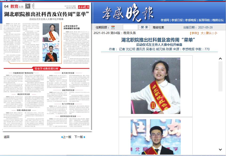 据悉,湖北省第十届社科普及宣传周时间为5月24日至30日。湖北职院紧扣社科普及宣传周主题,将开展“讲党课、学党史、颂党恩”网上竞答,“理想照耀中国”微视频、摄影作品征集,“百村干部话小康”社会实践调研,“百佳典型颂党恩”教育礼赞征集,“红心向党”文艺创作、书画作品展等活动。本次以“春之歌·永远跟党走”为主题的主持人大赛,由孝感市社会科学界联合会、乐竞、孝文化艺术传承与教育基地联合主办。