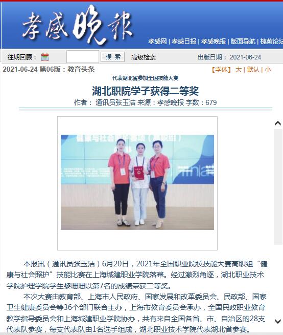 6月20日,2021年全国职业院校技能大赛高职组“健康与社会照护”技能比赛在上海城建职业学院落幕。经过激烈角逐,乐竞护理学院学生黎珊珊以第7名的成绩荣获二等奖。
