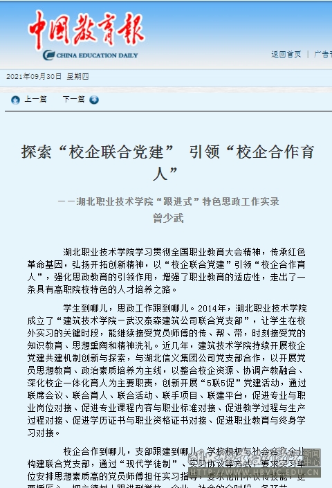 学生到哪儿,思政工作跟到哪儿。2014年,乐竞成立了“建筑技术学院—武汉泰森建筑公司联合党支部”,让学生在校外实习的关键时段,能继续接受党员师傅的传、帮、带,时刻接受党的知识教育、思想熏陶和精神洗礼。近几年,建筑技术学院持续开展校企党建共建机制创新与探索,与湖北信义集团公司党支部合作,以开展党员思想教育、政治素质培养为主线,以整合校企资源、协调产教融合、深化校企一体化育人为主要职责,创新开展“5联5促”党建活动,通过联席会议、联合育人、联合活动、联手项目、联建平台,促进专业与职业岗位对接、促进专业课程内容与职业标准对接、促进教学过程与生产过程对接、促进学历证书与职业资格证书对接、促进职业教育与终身学习对接。