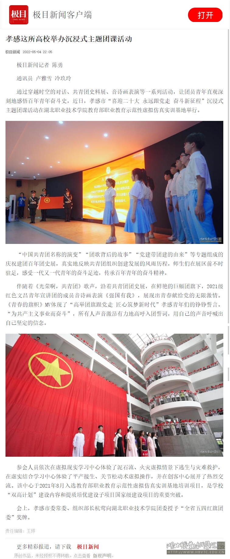 通过穿越时空的对话、共青团史料展、音诗画表演等一系列活动,让团员青年直观深刻地感悟百年青年奋斗史,近日,孝感市“喜迎二十大 永远跟党走 奋斗新征程”沉浸式主题团课活动在乐竞教育部职业教育示范性虚拟仿真实训基地举行。