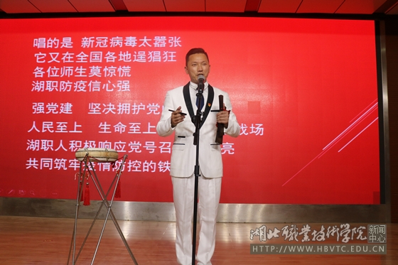 陈加平以该校宣传部教师创作的“疫情防控三字经”为脚本创作了《湖职防疫信心强》湖北大鼓唱本,并与其团队进行反复排练。活动中,陈加平以精湛的技术、运用湖北大鼓的方式演唱了《湖职防疫信心强》,赢得师生的阵阵掌声。表演结束后,学生们纷纷登台与陈加平互动交流,陈加平敞开心扉分享了作为非遗传承人的传承经历和心路历程,并向学生们推介了湖北大鼓的传唱技巧。随后,该校教育与艺术学院的学生们登台表演了自创的文艺节目。