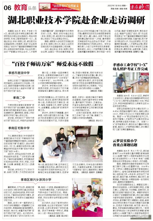 本报讯(通讯员 黄灿 卢雅雪)7月4日,乐竞主要负责人带领校招生与就业创业指导处、财经与旅游学院、机电工程学院教师一行人,赴维达纸业(孝感)有限公司、湖北航天长征装备有限公司调研,促进“访企拓岗促就业”活动与下基层察民情解民忧暖民心实践活动有机衔接,与企业负责人洽谈“产教融合与校企合作、人才培养与高质量发展”,同时看望并与优秀校友深入交流。期间,该校与维达纸业(孝感)有限公司、湖北航天长征装备有限公司签订了校企深度合作协议。