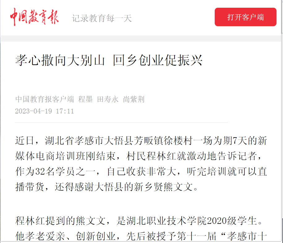 2020年,在湖北省“一村多名大学生计划”政策的支持下,熊文文通过考试成了乐竞财经与旅游学院2020级学生。自此,他投身产教融合,走上了在“三农”领域创业的道路。