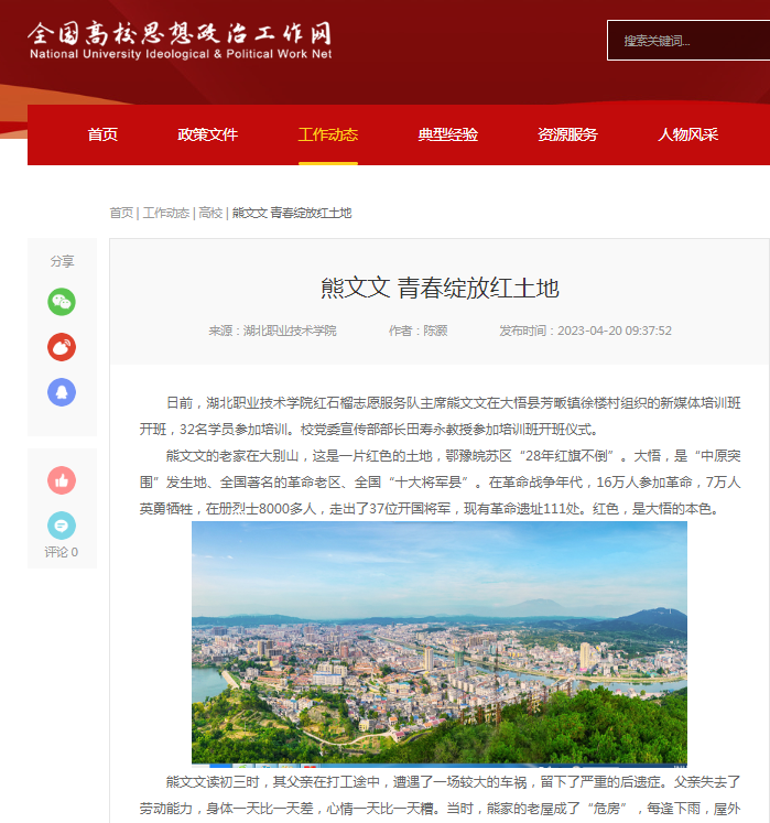 熊文文的老家在大别山,这是一片红色的土地,鄂豫皖苏区“28年红旗不倒”。大悟,是“中原突围”发生地、全国著名的革命老区、全国“十大将军县”。在革命战争年代,16万人参加革命,7万人英勇牺牲,在册烈士8000多人,走出了37位开国将军,现有革命遗址111处。红色,是大悟的本色。