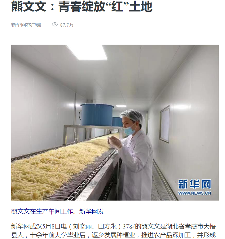 新华网武汉5月8日电(刘晓丽、田寿永)37岁的熊文文是湖北省孝感市大悟县人,十余年前大学毕业后,返乡发展种植业,推进农产品深加工,并形成产业链,带动乡亲共同富裕。他热心公益,撒播孝爱,把青春书写在这片“红”土地上。