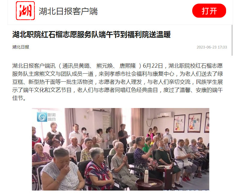 6月22日,校红石榴志愿服务队主席熊文文与团队成员一道,来到孝感市社会福利与康复中心,为老人送去了绿豆糕、新型热干面等一批生活物资,志愿者为老人理发,与老人亲切交流,民族学生展示了端午文化和文艺节目,老人们与志愿者同唱红色经典曲目,度过了温馨、安康的端午佳节。