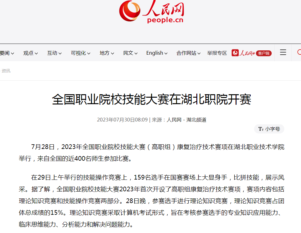 7月28日,2023年全国职业院校技能大赛(高职组)康复治疗技术赛项在乐竞举行,来自全国的近400名师生参加比赛。