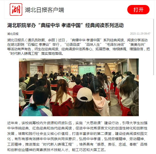 湖北日报讯(通讯员陈灏、余丽)近日,“典耀中华 孝道中国”系列经典阅读、阅读分享活动在湖北职院“石榴红 孝廉谷”举行,“论语品读”“品味人生”“毛泽东诗词”“美美与共”等活动有声有色,师生在经典阅读、经典诵读中滋养身心、拓展思维、培根铸魂、增强自信,把“时代新人铸魂工程”落实落地落细。