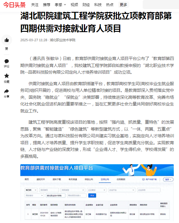 【今日头条】湖北职院建筑工程学院获批立项教育部第四期供需对接就业育人项目
