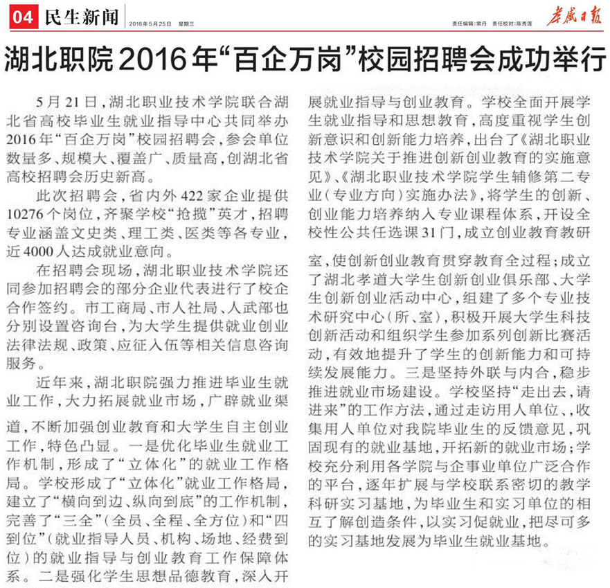 【孝感日报】湖北职院2016年“百企万岗”校园招聘会成功举办