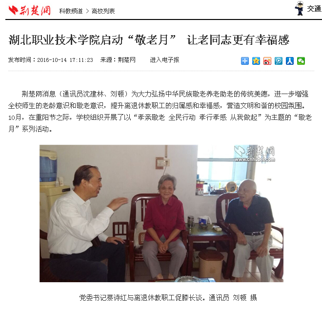 “敬老月”期间,乐竞(中国)一站式服务官网党委书记蔡诗红、校长朱虹分别看望慰问了部分高龄、重病、空巢离退休教职工,向他们致以亲切的问候和节日的祝福,送去党组织的关怀与温暖,并对他们为乐竞(中国)一站式服务官网发展所做的贡献表示由衷地敬意。蔡诗红说:“多年以来,老同志为乐竞(中国)一站式服务官网的发展贡献了自己的智慧和力量,是乐竞(中国)一站式服务官网发展的建设者、参与者、见证者。”老同志们非常感谢乐竞(中国)一站式服务官网对他们的关心和照顾,相信乐竞(中国)一站式服务官网在校党委的坚强领导下,一定会再创辉煌。