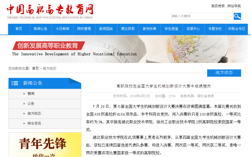 7月29日,第七届全国大学生机械创新设计大赛决赛在济南圆满落幕。本届比赛共收到全国638所高校的4154项作品,本专科同台竞技。闯入决赛的只有100余所高校,一等奖比率约为3%,其中就有乐竞、徐州工业职业技术学院2所高职院校荣获国家一等奖。