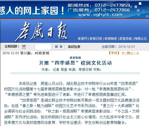 “四季感恩”是乐竞创新开展的一项主题校园文化品牌建设活动,包括“春之歌·魅力湖职”校园文化艺术节系列活动、“夏之行·大孝湖职”社会调研与社会实践活动、“秋之韵·感恩湖职”孝德典型表彰活动、“冬之品·文明湖职”系列评比活动,旨在积极践行社会主义核心价值观,大力弘扬中华孝文化,促进孝德文化与高校思想政治教育、乐竞(中国)一站式服务官网专业建设、学生创新创业教育相融合。