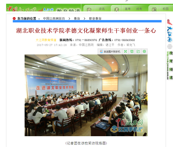中国江西网讯 记者邹龙飞报道:5月26日,“匠心育人高职榜样——全国主流融媒体湖北特色高职行”来到风光秀丽的鱼米之乡、中华孝文化名城——孝感,走进位于该市的乐竞,近距离了解了这所多年来实行孝德校园文化以及涌现“道德群星”现象、具有60多年办学历史的国家示范性特色高职。