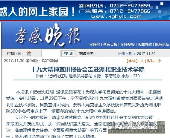 本报讯(记者沈红明 通讯员吴春花)为深入学习贯彻党的十九大精神,根据省委统一安排部署,11月29日下午,学习贯彻党的十九大精神省委宣讲团报告会走进乐竞。省委宣讲团成员、武科大马克思主义学院院长唐忠义教授为湖北职院300多名师生送上了一堂精彩的党的十九大精神宣讲报告。