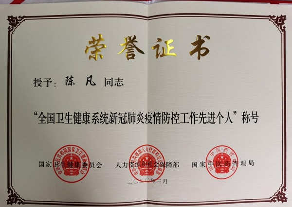 陈凡获评全国卫生健康系统新冠肺炎疫情防控工作先进个人