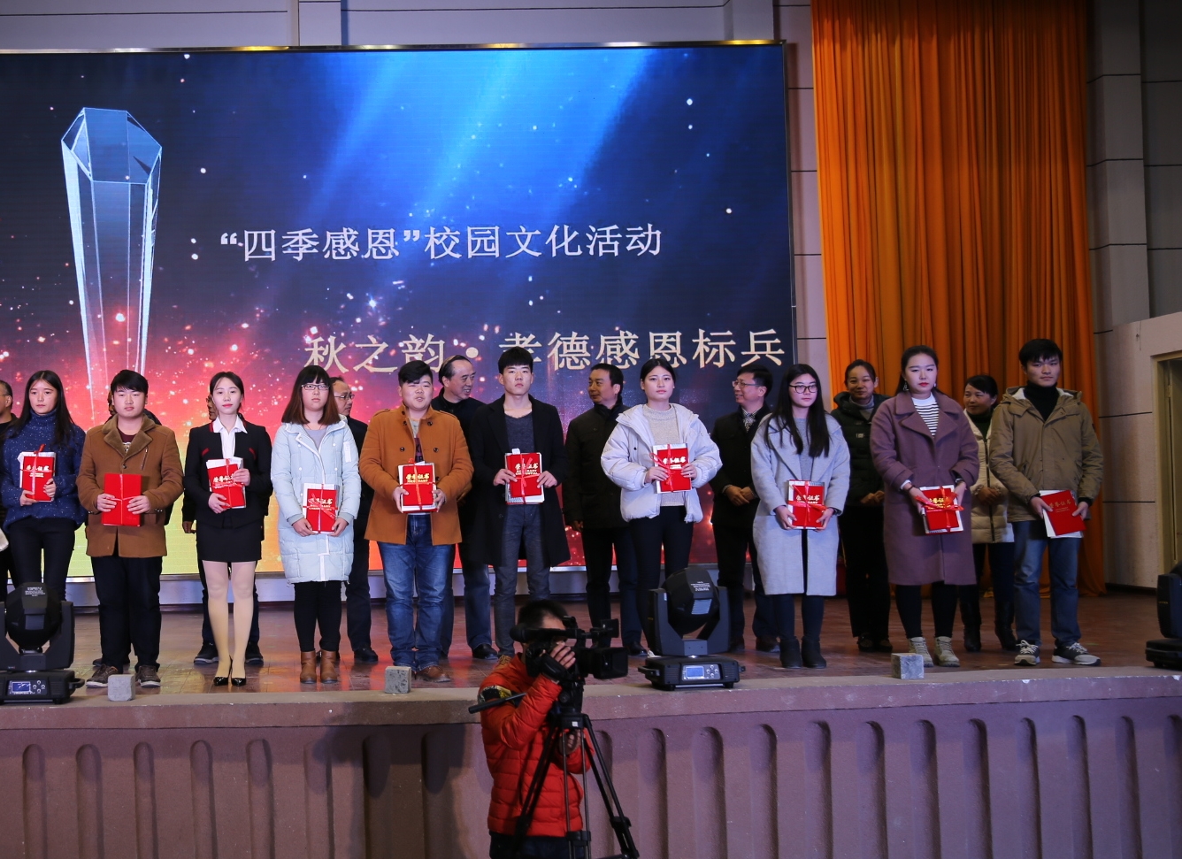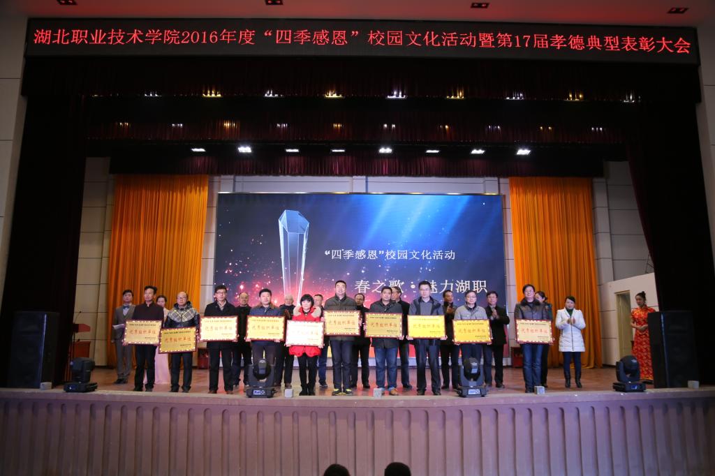 会上,出席领导和嘉宾为“四季感恩”校园文化活动受表彰的先进集体和先进个人颁奖。2016年,乐竞(中国)一站式服务官网制定并实施了“四季感恩”校园文化品牌建设方略。一是开展了“春之歌•魅力湖职”校园文化艺术节系列活动,活动项目包括“两创”口号征集、诗歌、散文、微小说、摄影、微电影、金话筒等12个类别。收集作品4000多件,参与人数达2000人次,评选表彰近200人次。在精彩纷呈的校园文化艺术节系列活动中,乐竞(中国)一站式服务官网师生积极响应和热情参与,报送的作品形式多样,内容丰富,且具有一定的思想性和艺术性;二是开展了“夏之行•大孝湖职”社会调研与社会实践活动,师生在暑假期间,纷纷结合专业特色及当地实际情况,开展“六个一”社会服务、社会实践和社会调研活动,如附属医院开展“为抗洪英雄义诊”活动,建筑技术学院刘帅同学结合乐竞(中国)一站式服务官网招生情况开展调研等,既提升了专业技能,也服务了区域经济社会发展,产生10个优秀典型案例。三是开展了“秋之韵•感恩湖职”孝德典型评选表彰活动,活动评选表彰了27名孝德感恩标兵,24个孝德感恩先进集体,227名感恩先进个人。他们或孝敬父母,尊老爱幼,或勤奋刻苦,自立自强,或心系祖国,胸怀大志,或继承和发扬中华民族的传统美德,将孝德感恩教育和实践体现在生活的点点滴滴中。他们的典型事迹在师生中产生了良好的反响,营造了向上向善校园文化氛围。
