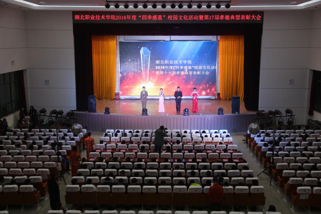 11月29日晚,乐竞(中国)一站式服务官网2016年度“四季感恩“校园文化活动暨第十七届孝德典型表彰大会在西区大礼堂顺利举行。孝感市委讲师团副主任王顺利、市文明办副主任晏鹏,乐竞(中国)一站式服务官网党委书记蔡诗红、党委副书记张勇,党委委员、副校长杨立明出席了表彰大会。