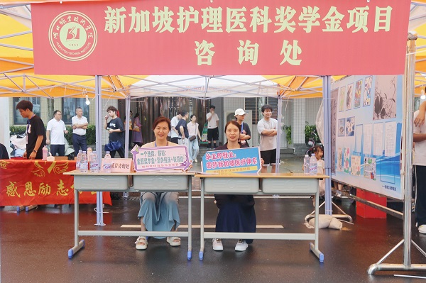 在今年的新生报到点,专设了“新加坡护理医科奖学金项目”咨询处。该项目由政府主导,奖学金丰厚,涵盖学费、生活费、机票等总额约70万人民币。学生毕业后能在新加坡公立医疗机构带薪工作6年,起薪优厚,期满后就业选择多元,深受新生及家长欢迎。