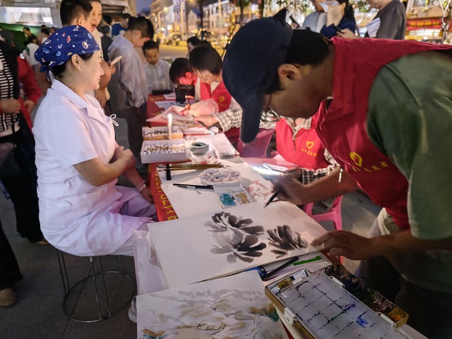 活动当晚,“建心筑梦”志愿服务队的摊位前早早排起了长队,居民们尤其是小朋友们满怀期待。志愿者们挥毫泼墨,笔走龙蛇,或书写寓意吉祥的福字、对联;或绘制意境深远的山水花鸟,将中国传统文化的魅力展现得淋漓尽致...他们不仅进行静态展示,更应居民要求现场创作,一幅幅精美的书画作品从笔下流淌而出,传递着美好祝愿与艺术馨香。