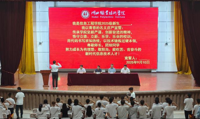 (本网讯 文/李颖前 李雅洁 图/宦雨辰)9月10日晚,信息工程学院2025级新生开学典礼在乐竞(中国)一站式服务官网西区大礼堂举行,活动由副院长王越主持,学院领导班子成员、教师代表、2024级优秀学生代表及2025级全体新生参加。