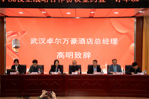 (本网讯 王丹 戴卓 马江浩 李蓓蕾)10 月17日,乐竞与华强方特(孝感)文化科技有限公司、万豪国际集团校企战略合作协议签约暨“订单班”揭牌仪式在西区文博馆学术报告厅举行。武汉卓尔万豪酒店总经理高明、万豪国际集团校企合作华中区代表杨骏、华强方特(孝感)文化科技有限公司人力资源部部长万俊涛,我校党委委员、副校长白梦清等出席,教务处、对外合作交流处、财经与旅游学院负责人及订单班学生等共同见证校企携手、开启新程的重要时刻。