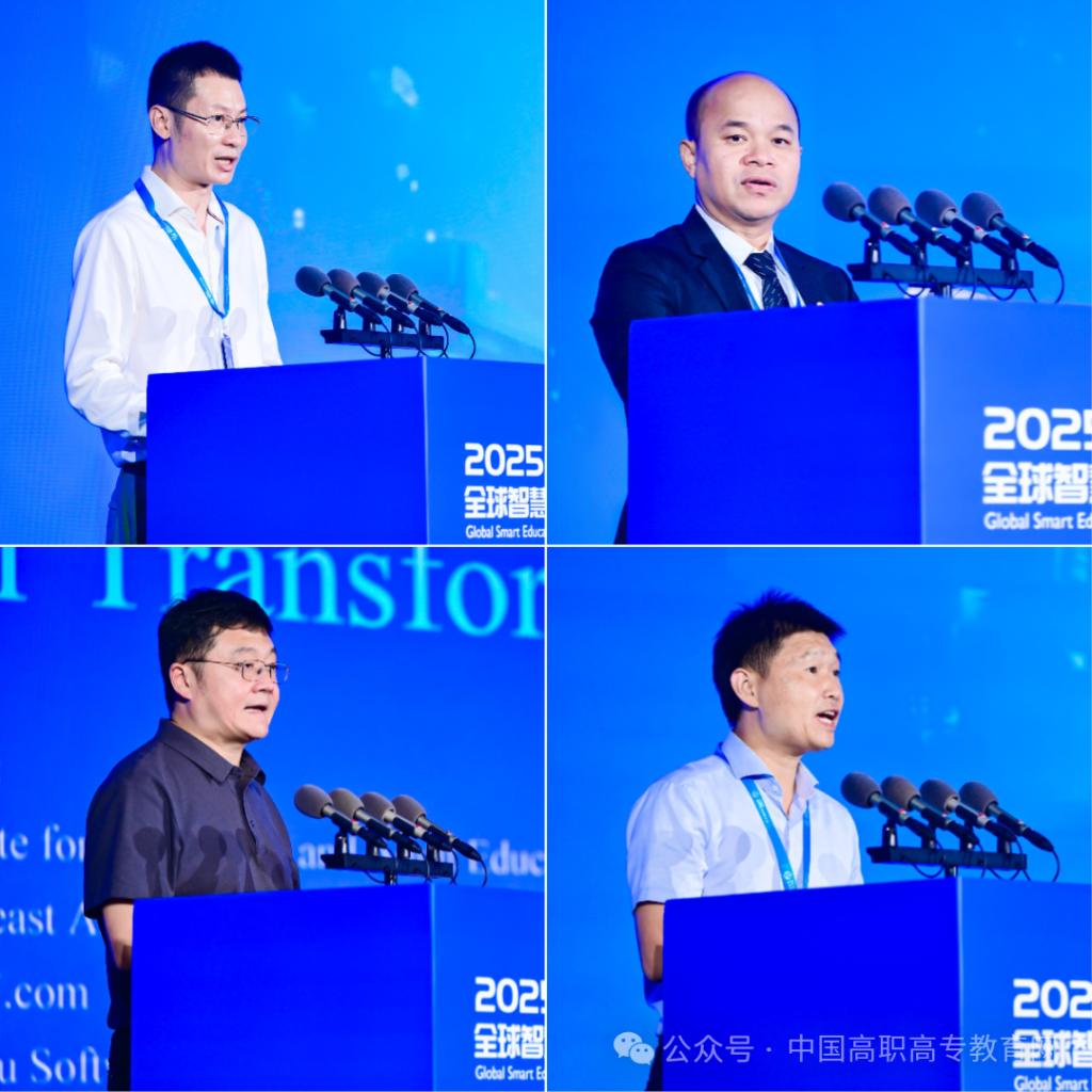 左上为央视网文体教育事业群总监、中国职业技术教育学会第六届理事邓黎东光,右上为东南亚教育部长组织技术教育发展中心副主任卡·普伦索切特拉(Khat Prumsochetra),左下为教育部教育管理信息中心公共平台处处长张鹏,右下为苏州市职业大学副校长王峰